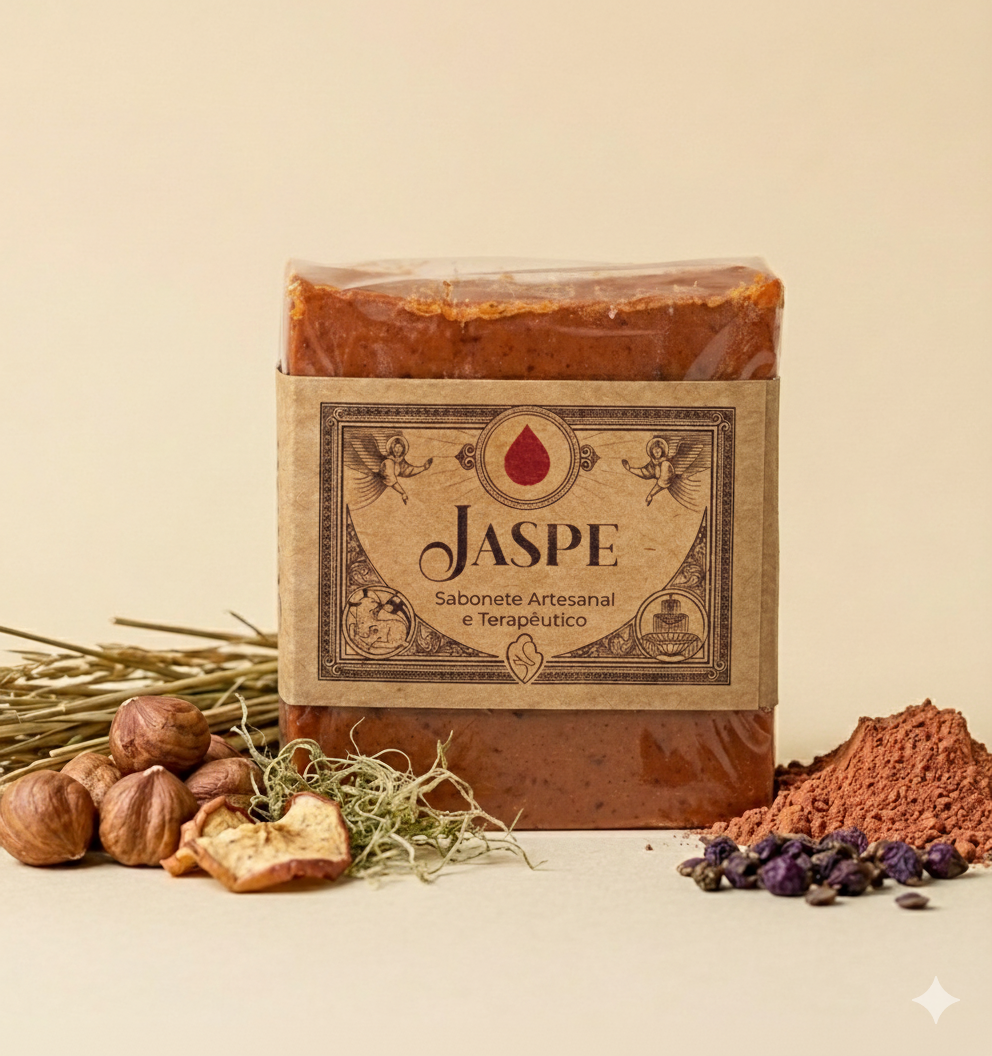 Sabonete Terapêutico em Barra Jaspe com manteiga de cacau, argila vermelha, extrato de Maçã e avelã e musgo de casca de árvore, que possui ação esfoliante